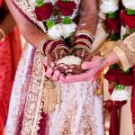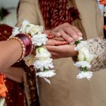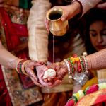 Next, the bride’s brother(s) step forward to place grains into the bride’s cupped hands, whilst reciting the mantra “the bride is going from her parent’s house to the house of the groom, having done her duties well before her betrothal. O’ bride, help us to remove obstacles just like a flood of water cleans the earth.” The bride will in turn then offer those grains the sacred fire. This is known as the lāja homa and is repeated four times. Each time is followed by the bride and groom doing agni- parikrama, also known as māngala-phera or lama (circumambulating of the sacred fire).