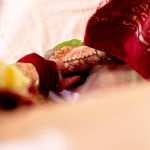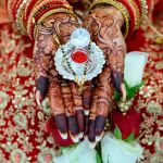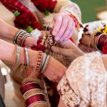 The groom will place his hand on the bride’s heart and recite the kāma stuti (prayer of love) “Who is giving what and to whom? Love is the Giver and Love the Receiver. Love has entered into the Ocean of Being. Through Love I receive you. O Love all this is for you.” (Atharva Veda 3:29:7). By reciting this mantra the groom acknowledges that the bride is the servant of God and that she is now in his care so that he can serve her. The father of the bride finally ties the brides chundri (veil) to the groom’s chadar (scarf), known as vastra-dhaaran or granthi-bandhan. The sacred knot containing auspicious items such as betel-nuts, gold, etc, is a symbol of the unbreakable union between the bride and groom. This is arguably where the saying “tying the knot” has been derived from.