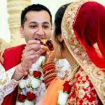 Up until this point, due to the marriage ceremony being a religious sacrifice, the bride, groom, priest and bride’s parents have abstained from food since the previous day. They have observed this fast to maintain cleanliness and purity. Now that the yajna (sacrifice) has been completed, they may partake in breaking their fast. The groom first feeds some prashadam (sanctified food) to his bride and in turn she feeds him. Usually this is in the form of a mithaai (Indian sweet) & it marks the occasion of the first meal that the bride and groom share as a married couple. Symbolically it signifies that from this day onwards, they will only speak sweet words to one another. It also signifies that from this day on, the couple will share everything together.